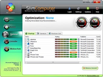 O SlimComputer também conta com o modo “Optimizer”, que mostra o consumo dos recursos do PC em tempo real e sugere que processos e serviços podem ser eliminados do inicio do sistema. Caso algum erro acontecer, a opção “Restore” permite recuperar os itens apagados.